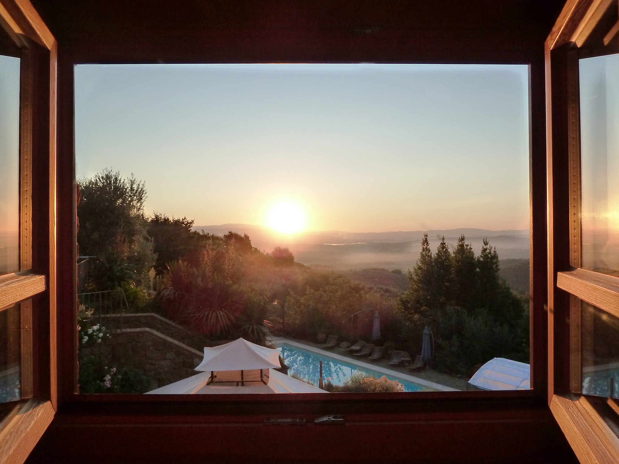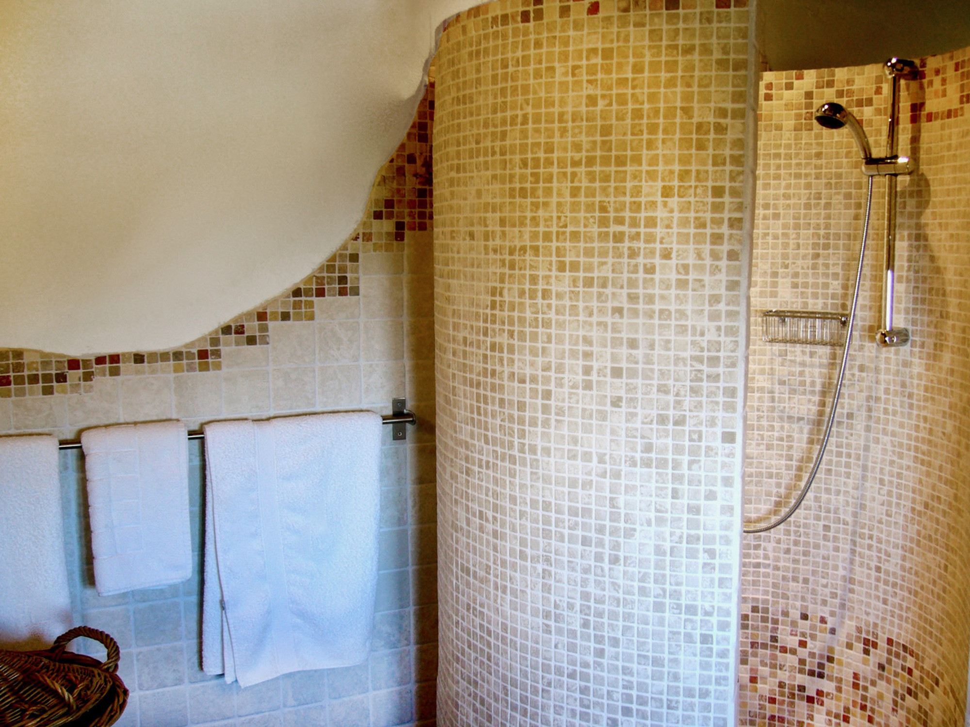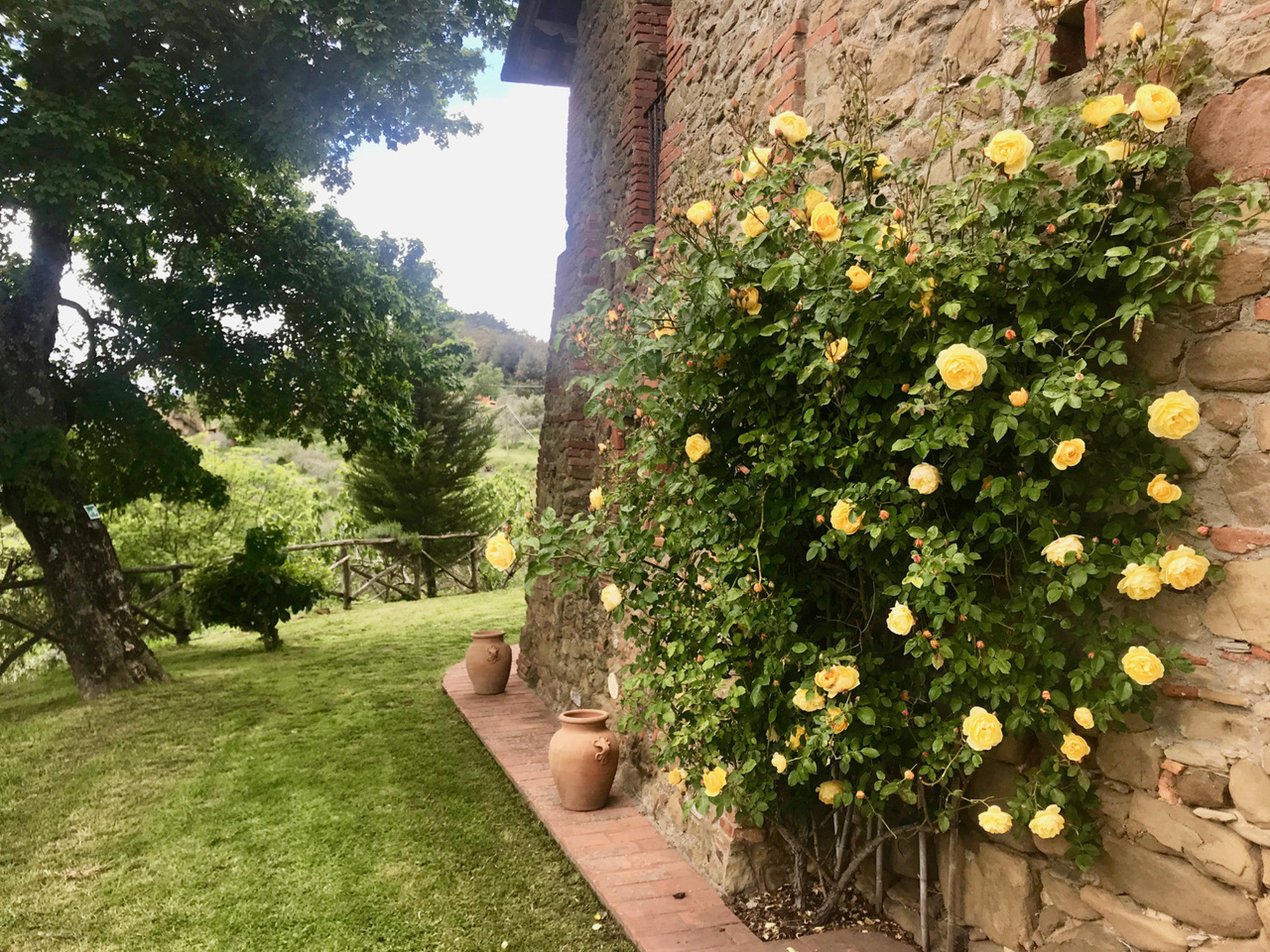 Im ersten Stock überzeugt das Schlafzimmer mit einem antiken schmiedeeisernen Bett und beeindruckendem Ausblick auf das Arnotal. Das elegante Bad aus Travertin mit Runddusche rundet das romantische Ambiente ab. Ideal für einen entspannten Urlaub in der Toskana!