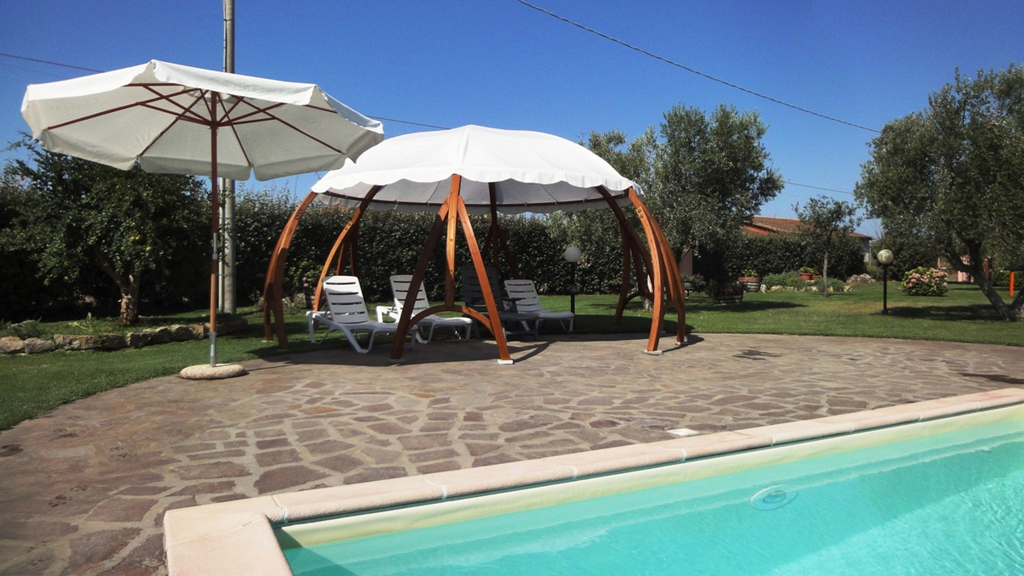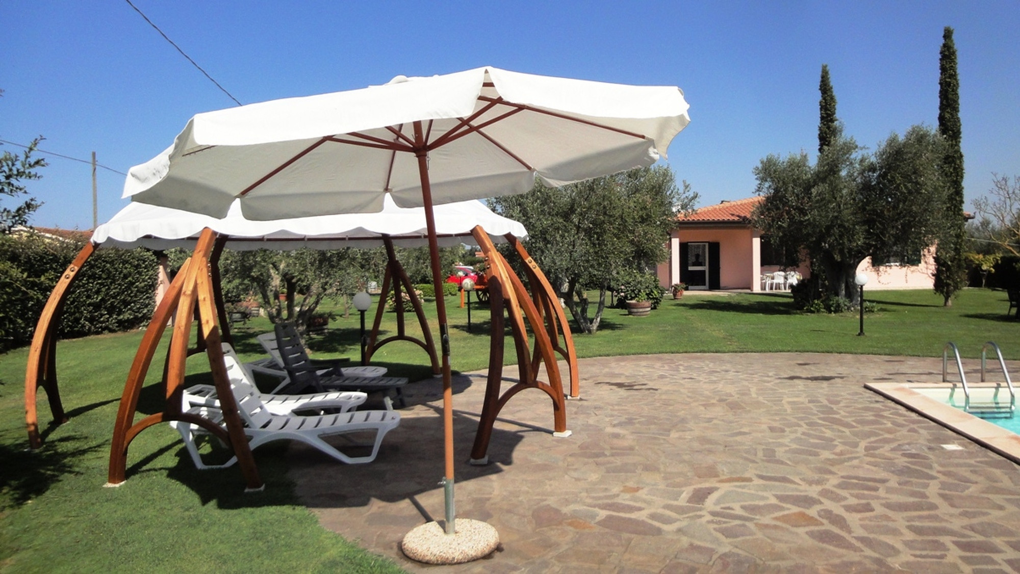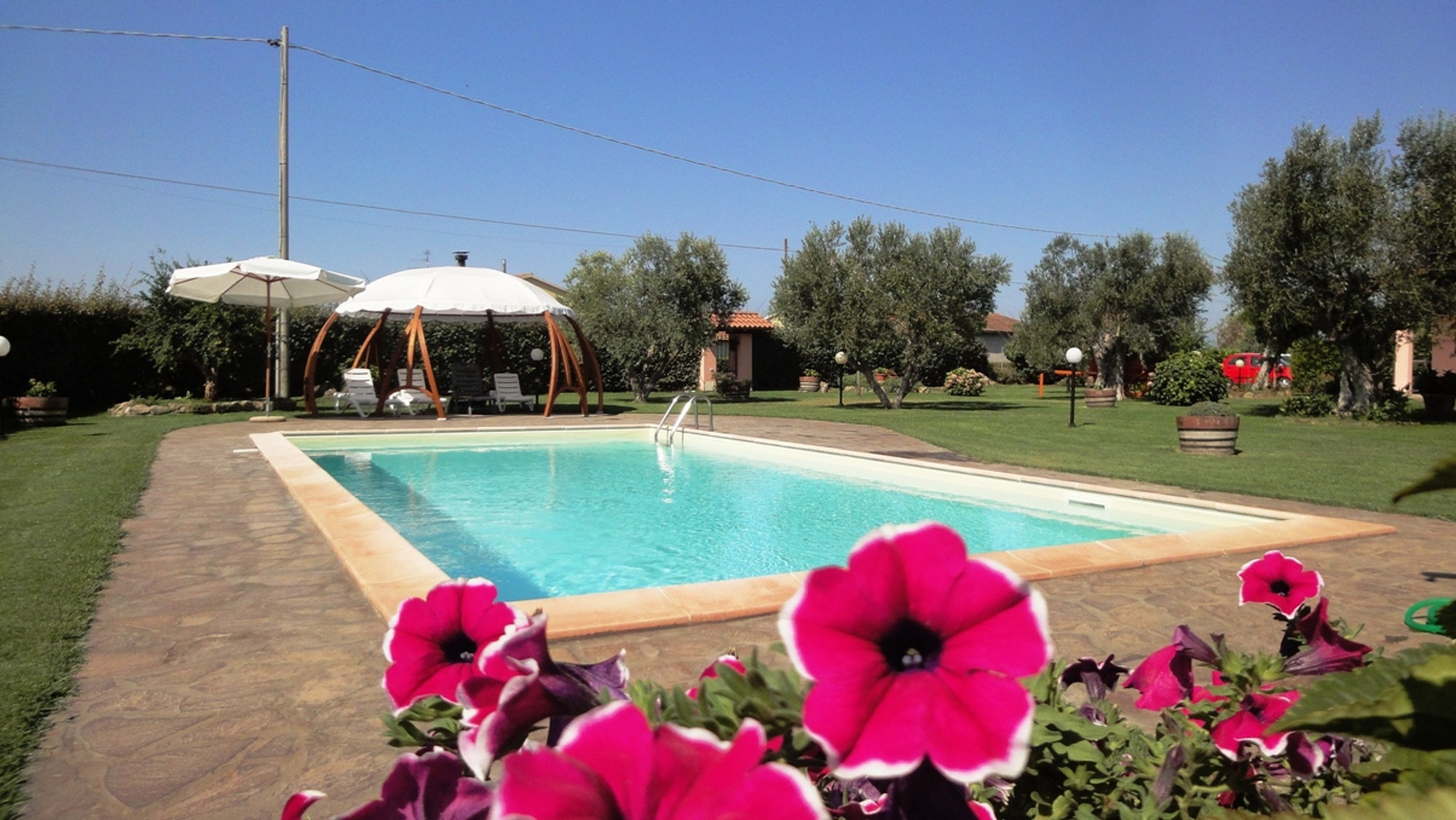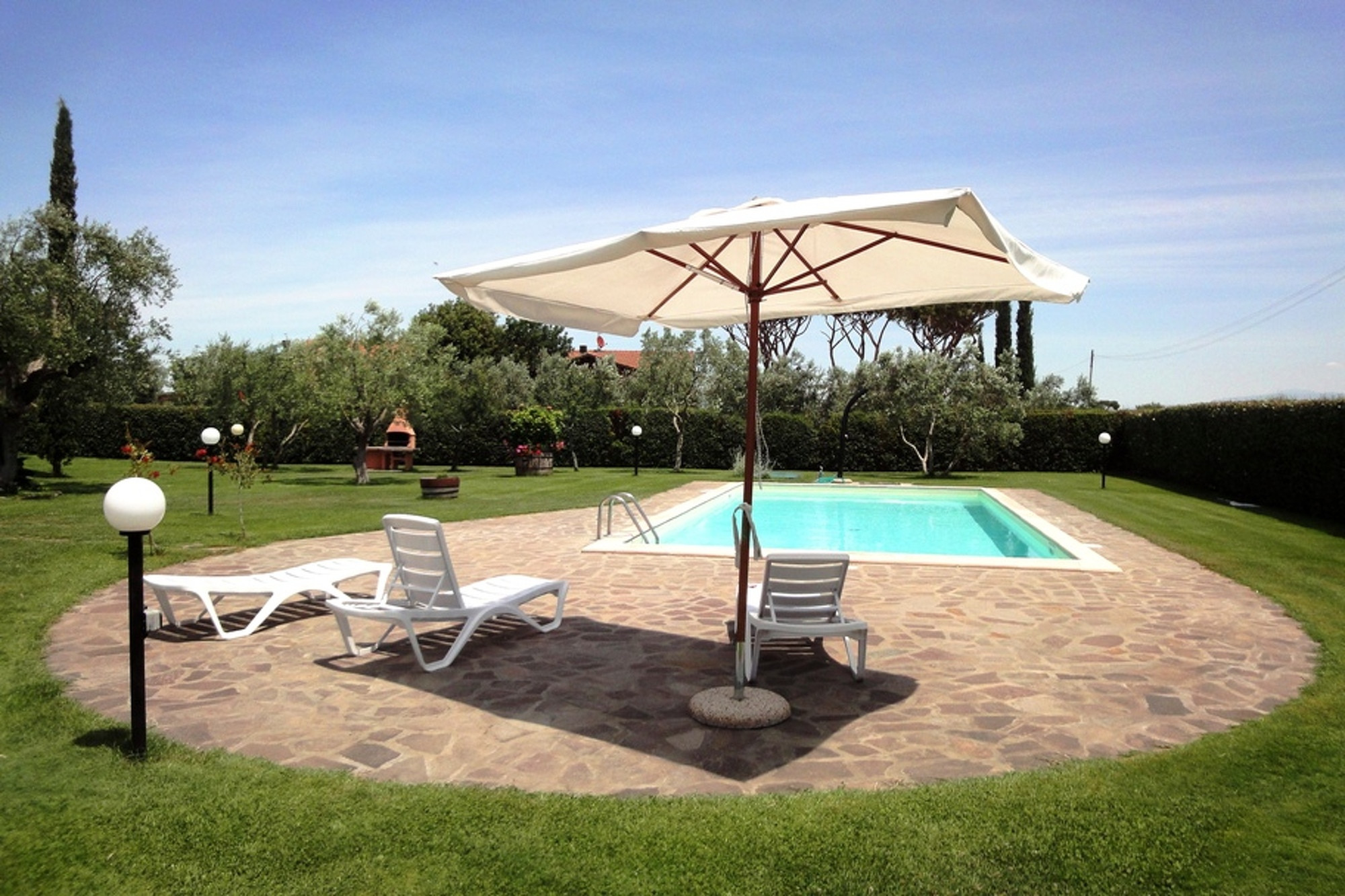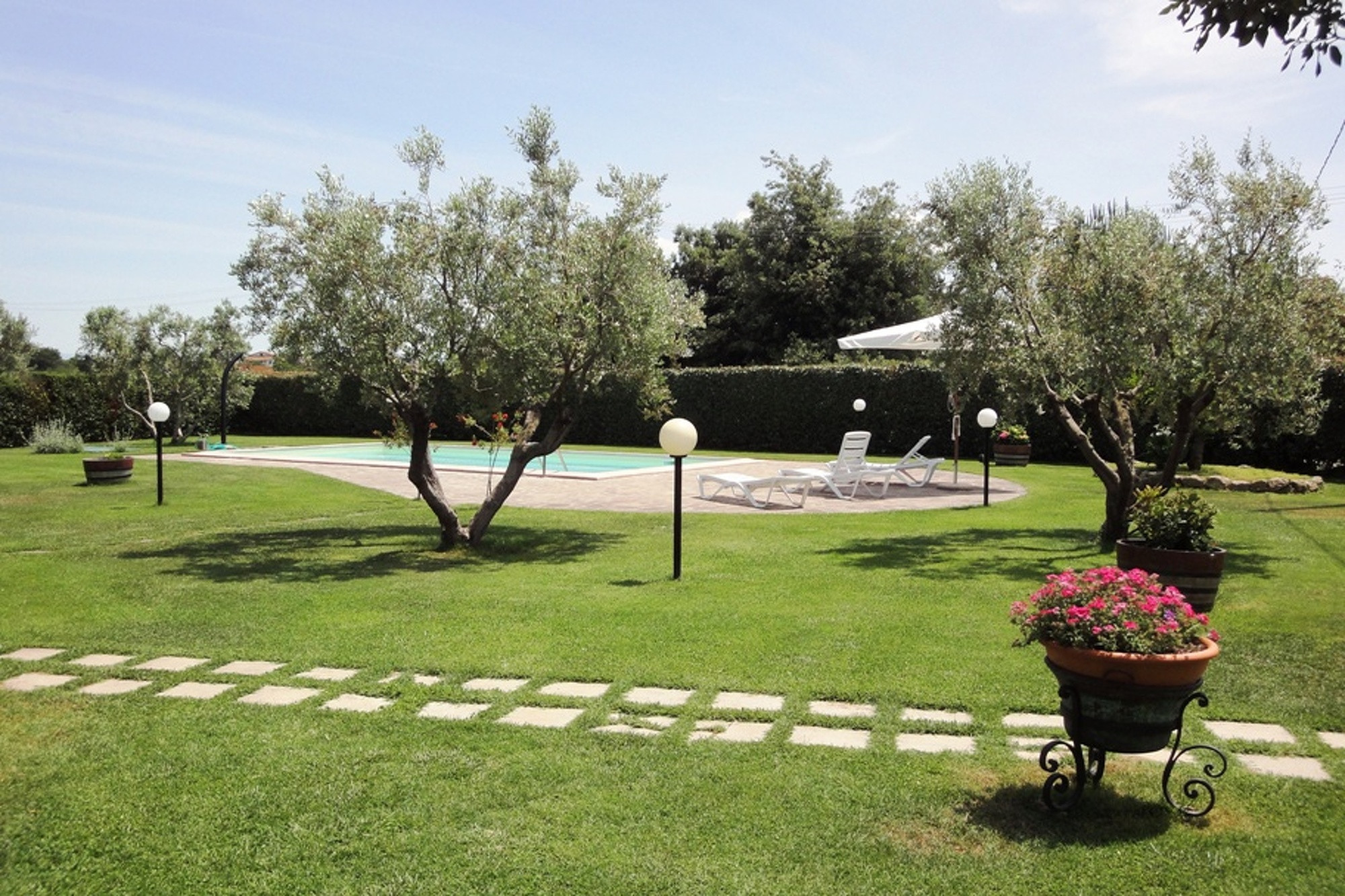 Umgeben von alten Olivenbäumen und Zypressen erwartet euch ein einladender Garten mit einem schönen Pool.